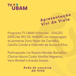 Chamada: Programa TV UBAM Entrevista - EDIÇÃO ESPECIAL RIO DE JANEIRO, dia 16 de junho, às 10h, em homenagem às pioneiras Doris Royer de Carvalho, Cecília Conde e Gabriele de Souza e Silva.